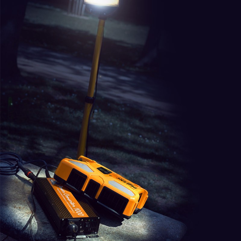 Een PELLENC-accu die is aangesloten op de omvormer kan een stroomaggregaat vervangen.