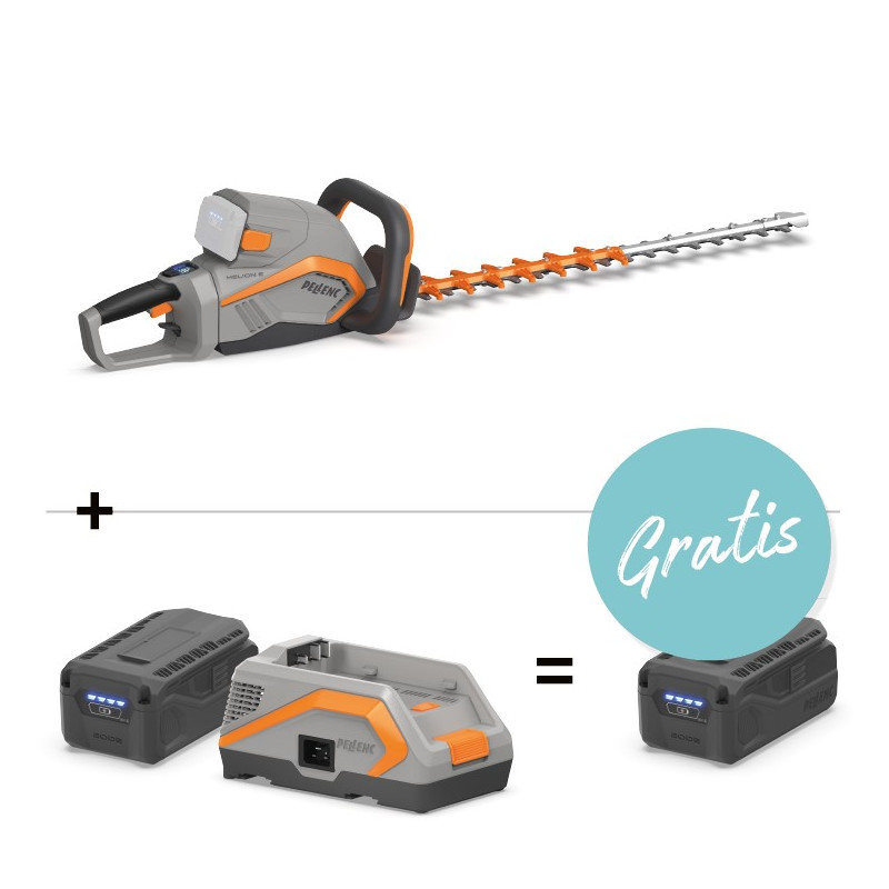 *Aanbieding geldig van 01/09/2025 tot 20/12/2025 bij gelijktijdige aankoop van een gereedschap, een accu en een lader uit het ESSENTIAL PELLENC-assortiment, in het PELLENC-netwerk dat deelneemt aan de actie en op store.pellenc.com/nl, zolang de voorraad strekt. De aangeboden accu is identiek aan de accu die in het pakket is gekocht. Aanbieding niet cumuleerbaar met andere lopende aanbiedingen van PELLENC.