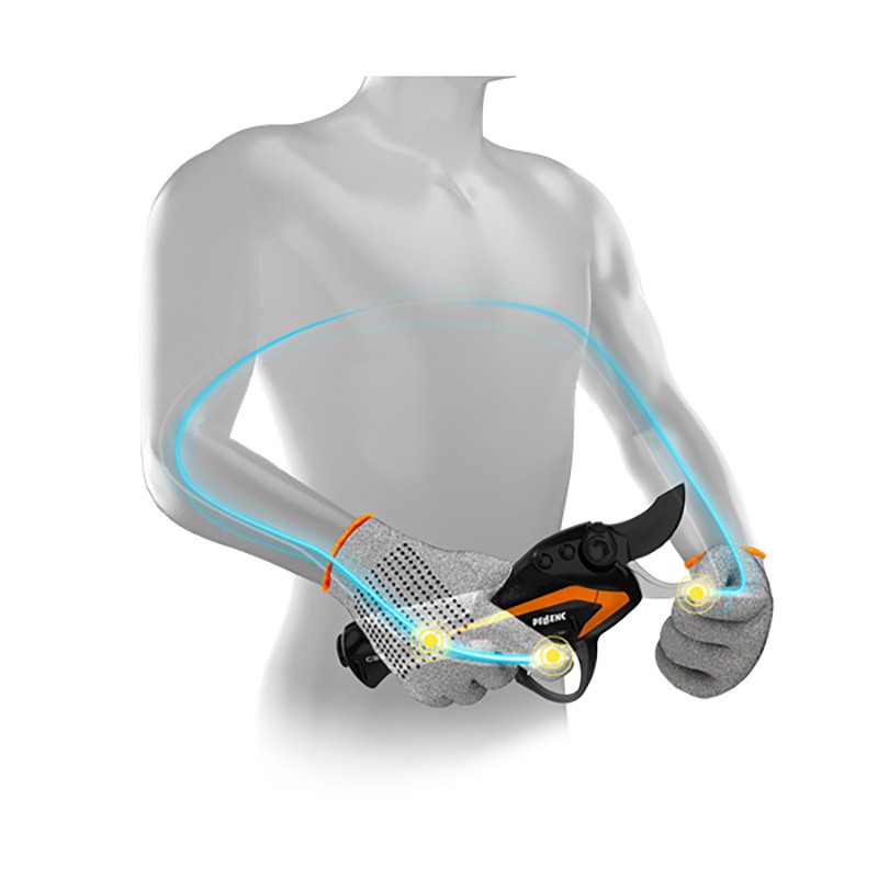 Le nouveau système anti-coupure Activ’Security du sécateur électrique permet de déclencher l’arrêt instantané de la lame au contact de votre main, avec ou sans gant PELLENC. Il fonctionne grâce à une boucle conductive naturelle créée via 3 points de contact.