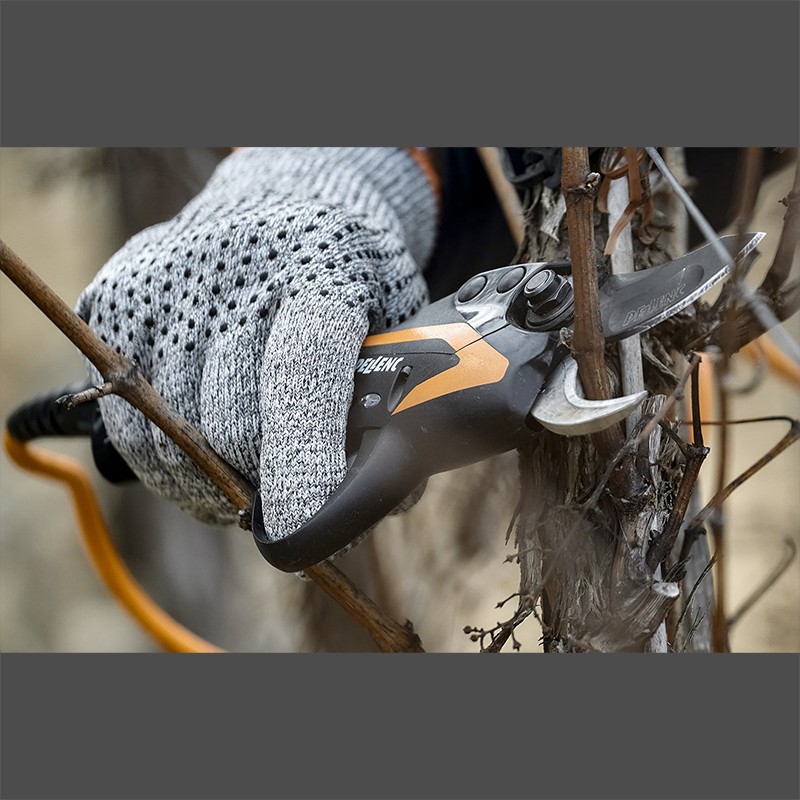 Dans des conditions très humides ou extrêmes, nous recommandons l’utilisation des gants conducteurs PELLENC. Très agréables à porter et ultra résistants, ils sont disponibles en 2 modèles au choix : « Confort » pour tenir l’outil et « Végétation » respirant/étanche.