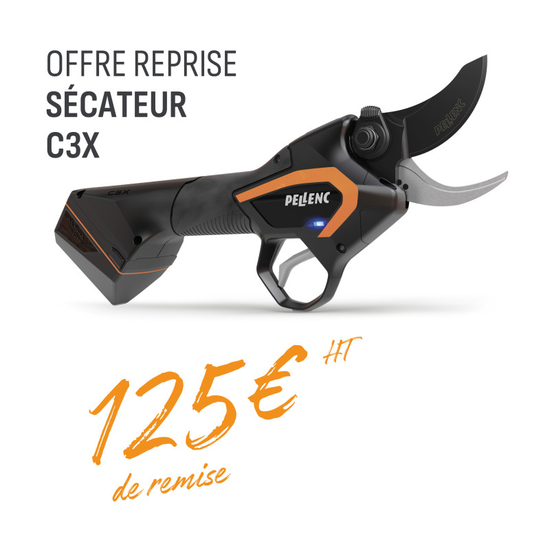 Pour l’achat d’un sécateur C3X, C35 ou C45, bénéficiez de 125 € HT de remise avec la reprise de votre ancien sécateur électrique PELLENC ou d’une autre marque.